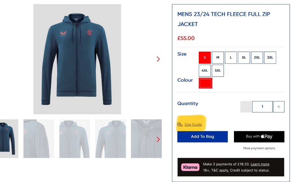Each product displays the size guide chart. This can be found on each product page under the sizing, as per the image below: